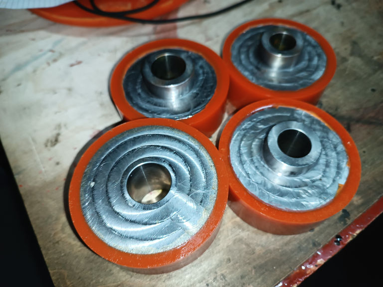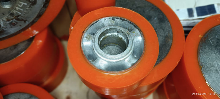 Механическая обработка металлической основы: Металлическая ступица колеса подвергается пескоструйной или дробеструйной обработке. Это создает шероховатую поверхность, которая значительно улучшает сцепление полиуретана с металлом. Также может проводиться токарная обработка для восстановления геометрии или создания специальных пазов.