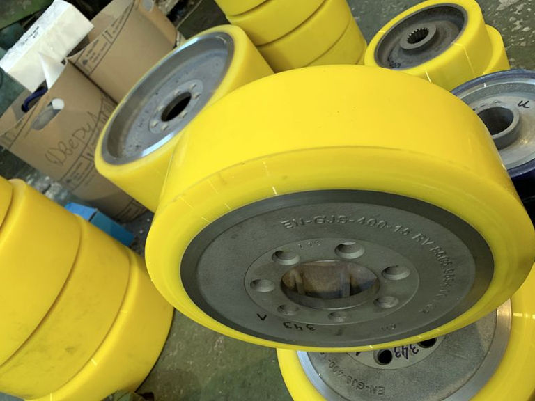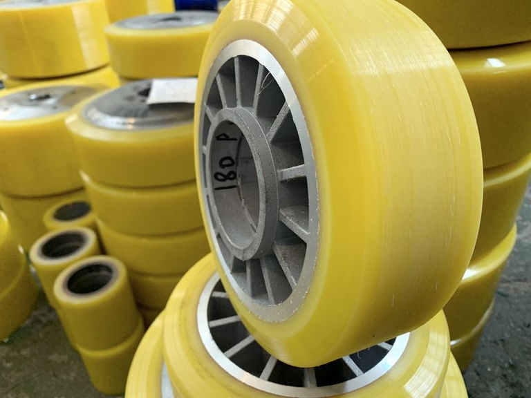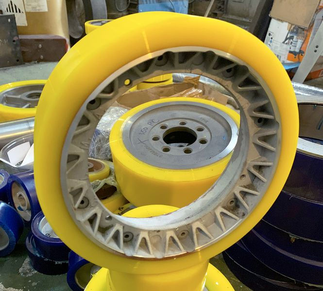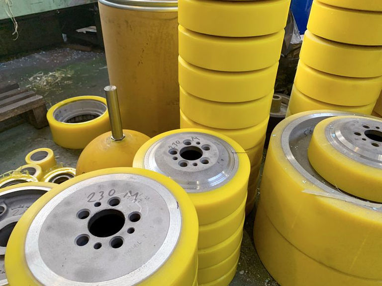 2. Гуммирование колёс полиуретаном: Этот процесс включает в себя нанесение полиуретанового слоя на металлические или пластиковые колёса, что обеспечивает дополнительную защиту и улучшает эксплуатационные характеристики.